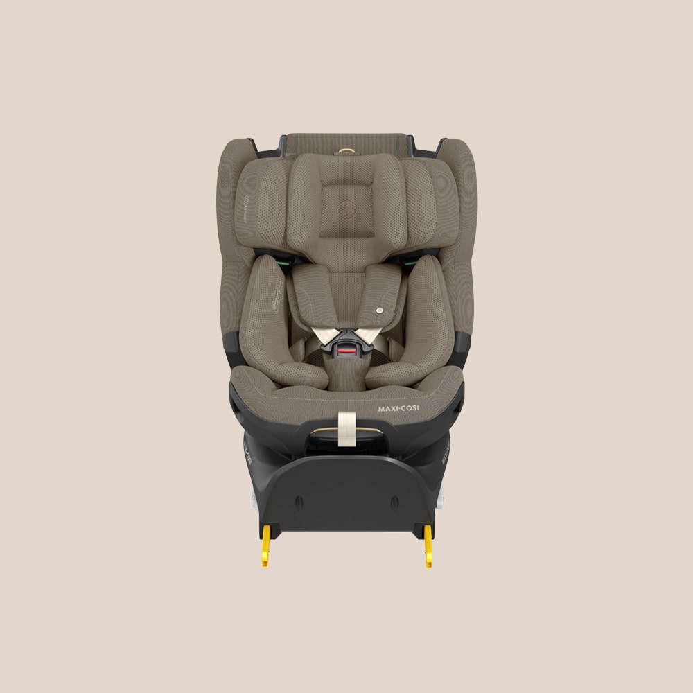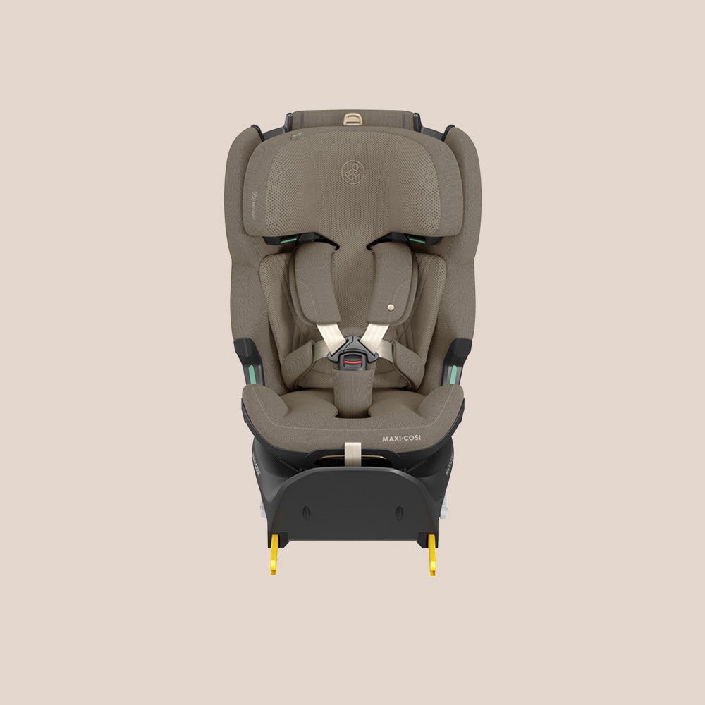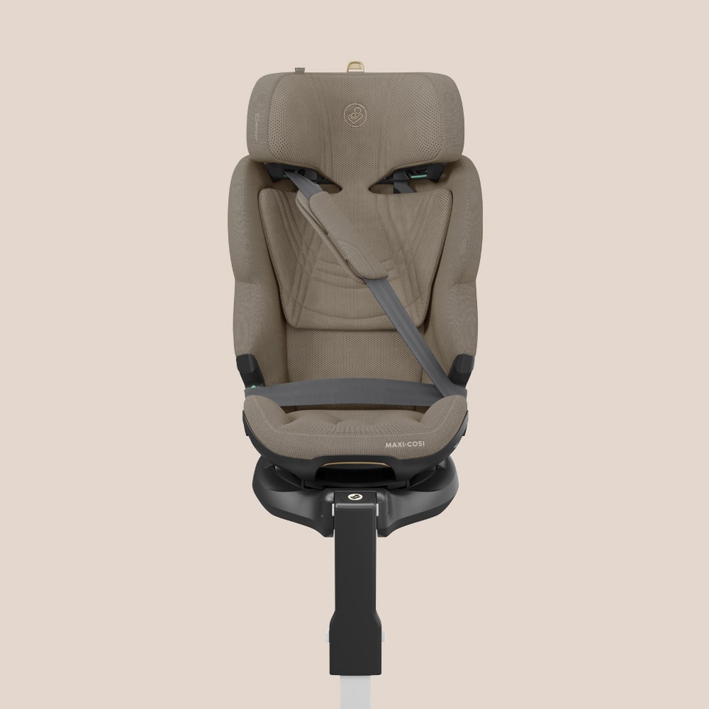 Rimuovi il cuscino riduttore e continua a far viaggiare il tuo bambino in senso contrario di marcia, assicurato con le cinture integrate nel seggiolino e con il piede di supporto installato.