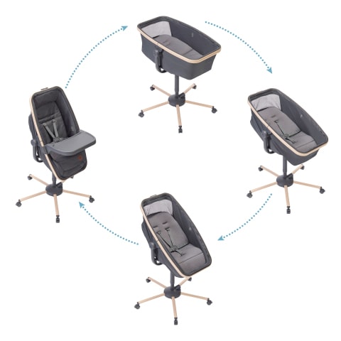 Elegante culla, poltrona reclinabile e seggiolone all-in-one, progettata per far fronte alle esigenze del tuo bambino durante tutto il giorno, rimanendo vicini l'uno all'altro.